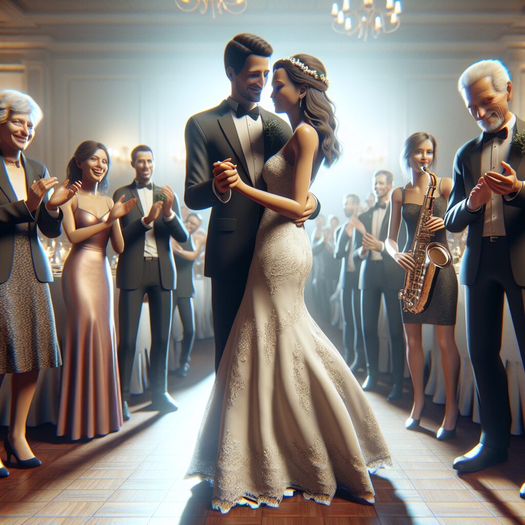Så lød den første rytmiske bas fra DJ’en. Et blødt beat, diskret og elegant. Musikken ændrede stemningen uden at ødelægge den. Og ud fra siden trådte saxofonisten. Ikke dramatisk – bare med overskud og nærvær. Han gik direkte hen til brudeparret, bøjede sig ned på ét knæ, og spillede et kort, kærligt fraspark – som en musikalsk invitation. En gestus så simpel og respektfuld, at hele lokalet brød ud i grin og klapsalver.